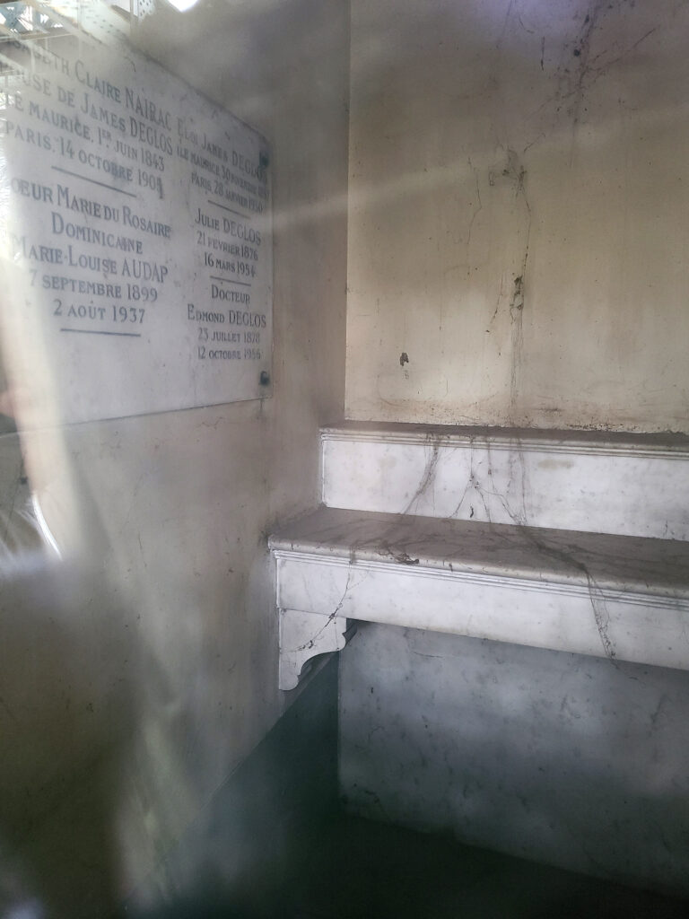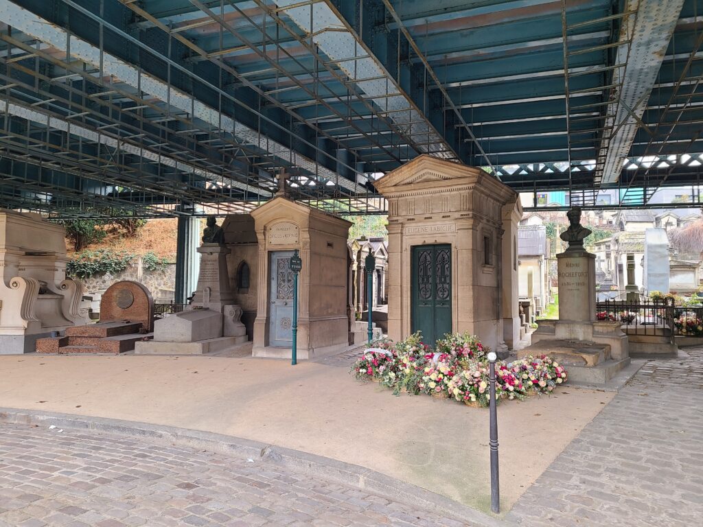 La recherche aura été rapide ! Au bout de l’Avenue Principale qui part de l’entrée du cimetière, sur le rond-point coincé sous la rue Caulaincourt qui distribue les allées, on a l’œil attiré par une tombe très fleurie : c’est celle d’Eugène Labiche. Une entrée en matière bien people. Et juste à sa gauche, en s’approchant, la tombe voisine indique sur son fronton « Familles Deglos Koenig ». Bingo !