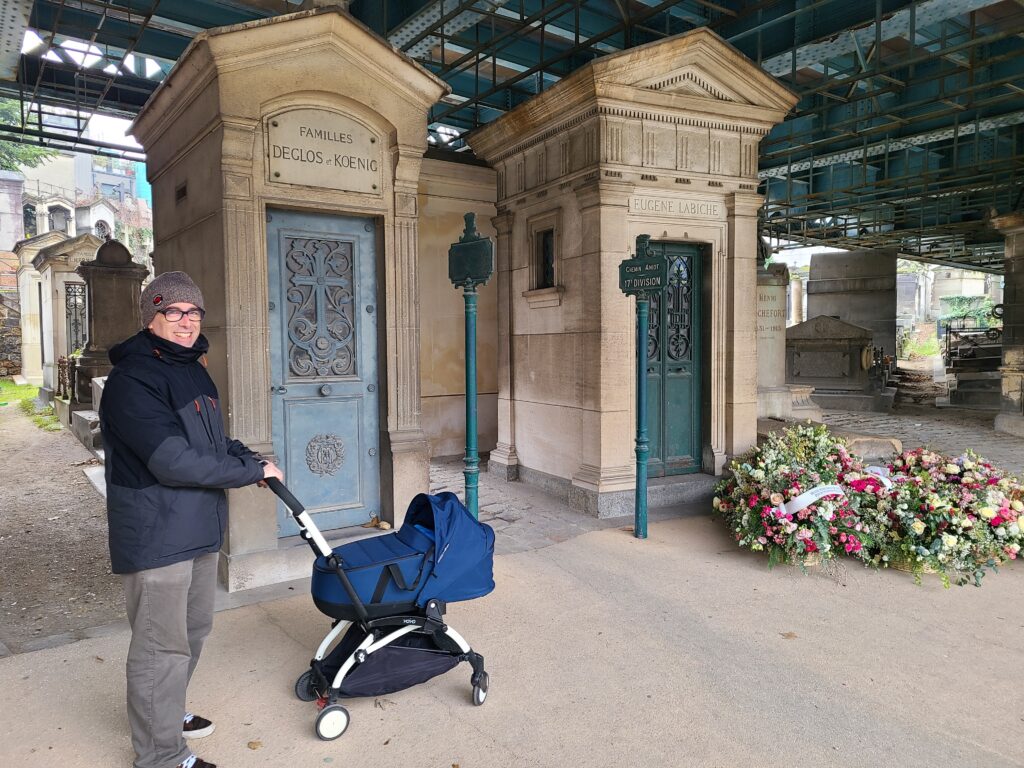 Tous deux sont enterrés au Cimetière de Montmartre, un prétexte tout trouvé pour promener Ellie dans sa nouvelle poussette citadine. Problème à l’arrivée au cimetière : le bureau des registres est fermé (on est dimanche) et donc impossible de savoir où se trouvent les tombes dans le cimetière. Tant pis, on tente une balade quand même, on verra bien….