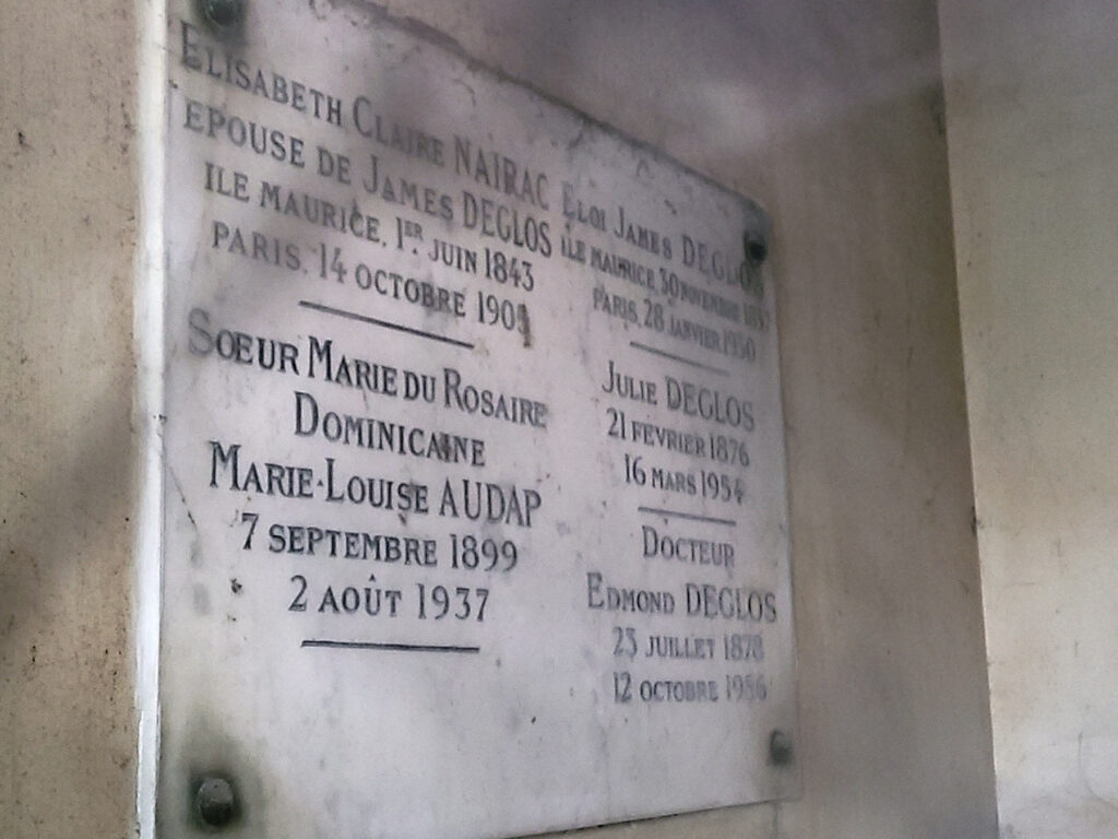 Eloi James DEGLOS et Claire NAIRAC sont les grands-parents maternels de Bonne Maman. Ils sont tous deux nés à l’Île Maurice. Ils s’y sont mariés et leurs enfants sont nés là bas. On retrouve ensuite leur trace à Paris, où ils pourraient être arrivés vers 1888. Ils s’installent dans le XVIIe arrondissement, au 16 rue de Logelbach. Puis, peut-être après la mort de Claire, James habite au 70 avenue de Villiers (il y est de 1910 à sa mort).