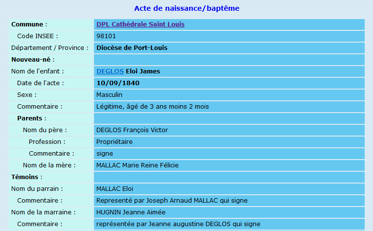Difficile de trouver l’acte de naissance d’Eloi «James» DEGLOS, dont on a découvert la tombe au cimetière de Montmartre il y a quelques jours, car James est né à Port-Louis en 1837, à l’époque où l’Île Maurice était anglaise. Il faudrait avoir accès aux archives numérisés par les Mormons, qui ne sont accessibles que sur microfilms consultables à… Salt Lake City. Bon. Il faudra se contenter de faire confiance aux dépouillements des registres d’Etat civil réalisés par le Cercle de Généalogie Maurice – Rodrigues (CGMR), qui sont en ligne. En gros : on n’a pas la photographie du registre d’état civil manuscrit, mais un aimable généalogiste amateur a recopié les informations principales.