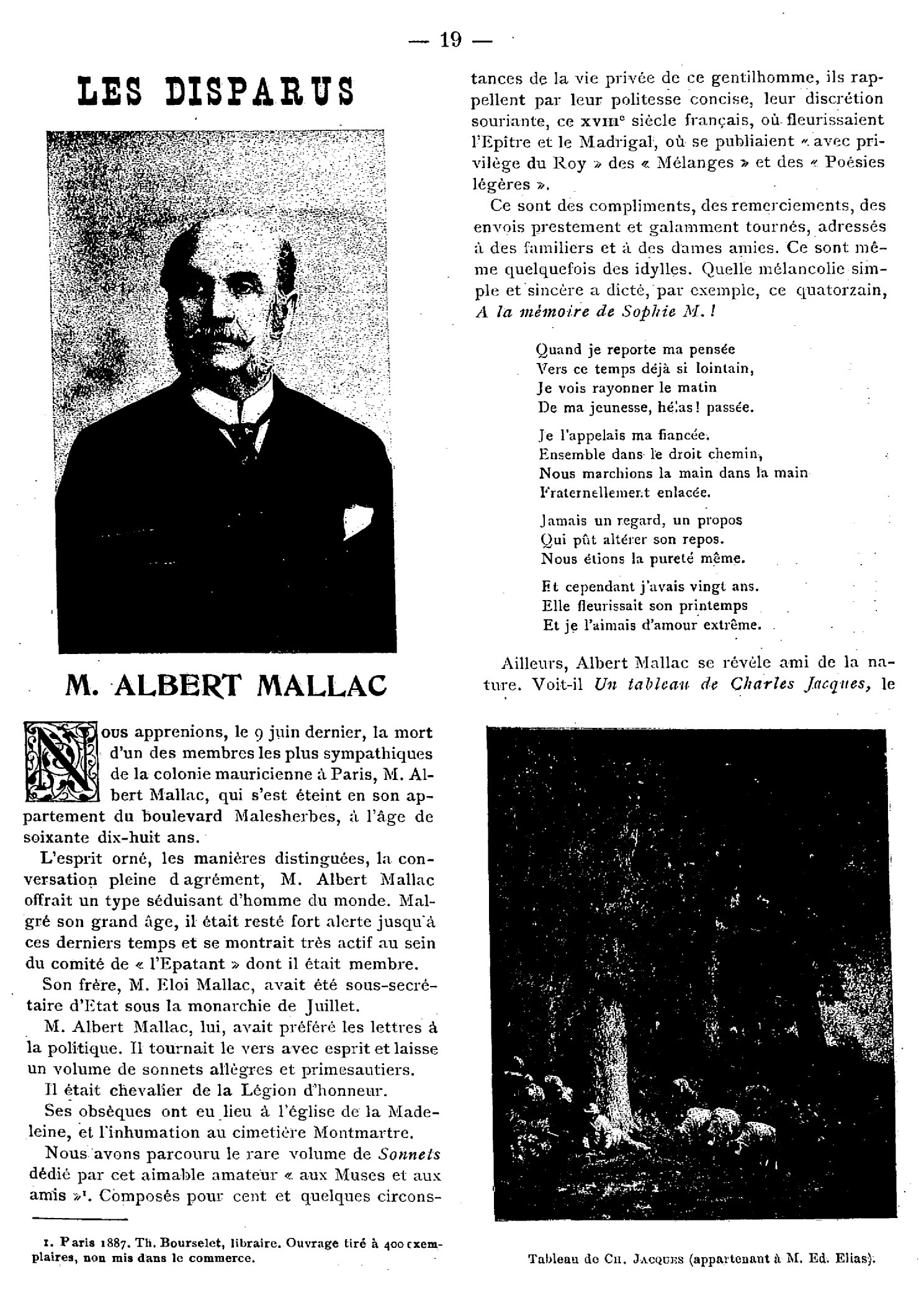 «Je vois, reproduit dans votre numéro du 3 août, le passage des Mémoires de M. de Pontmartin et qui a trait à mon frère, Eloi Mallac. Tous ceux qui, en France, ont connu mon frère, ont déjà fait justice de cet acte de vengeance posthume et d’insigne mauvaise foi. Voilà pour quoi j’ai dédaigné d’y répondre quand l’article a paru. Mais comme, à Maurice, où l’on est moins au courant de la vie politique d’Eloi Mallac, on pourrait croire aux dénigrements de M. de Pontmatin, je tiens à faire savoir à vos lecteurs d’où provenait cette malveillance de l’auteur des Mémoires vis-à-vis de mon frère. […] M. de Pontmartin voudrait donner à penser que c’est uniquement à ses succès de joli homme qu’Eloi Mallac a dû sa fortune politique. Eh ! bien, il ne fera croire à personne que des hommes comme M. Guizot, le premier en date des hommes politiques de ce temps qui ait distingué Eloi Mallac, au point de se l’attacher comme secrétaire particulier, alors que celui-ci avait à peine 24 ans ; que des personnages tels que Messieurs Molé, Duchâtel, Dumon, Rémusat, le Duc Victor de Broglie, père du Duc Albert de Broglie, Falloux, Vitet, le Père de Ravignan, Monseigneur Dupanloup, le Cardinal Donnet, Louis Veuillot, et tant d’autres que j’omets, ne pouvant les nommer tous, n’aient été séduits que par la beauté de l’homme, lorsqu’ils faisaient de lui leur ami, et bien souvent leur conseiller très-écouté, —j’ai tout un recueil de lettres autographes qui le prouvent— et qu’ils lui confiaient la direction de leur parti, puisqu’ils mettaient entre ses mains le journal qui était l’organe de ce parti.»