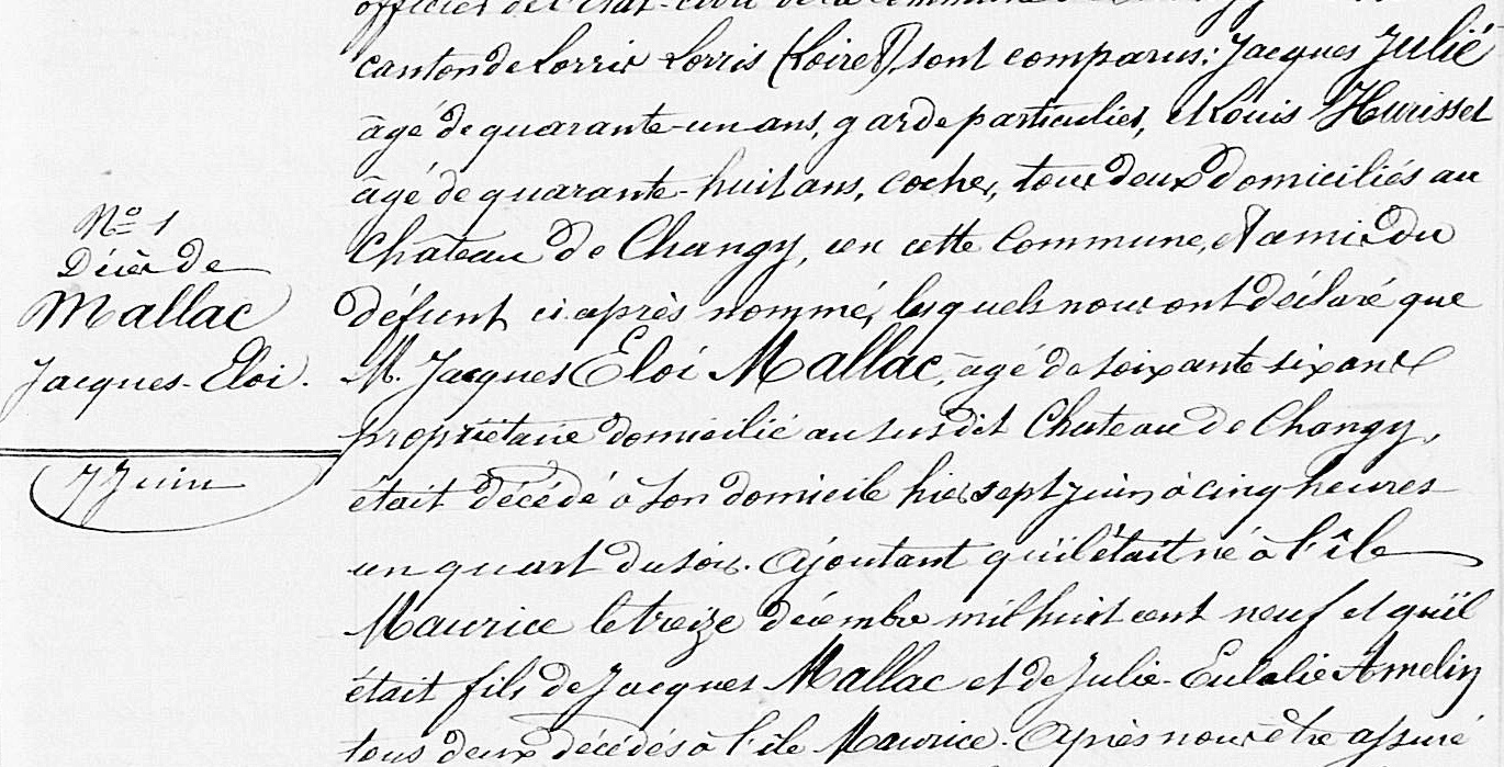 Eloi MALLAC a un CV impressionnant, qu’on déroule comme une pelote de laine en cherchant son nom sur Gallica, le site des archives de la BNF, et sa biographie aux Archives nationales. Né en 1809 à Port-Louis (qui s’appelait à ce moment Port-Napoléon) dans une île Maurice (qu’on appelait à l’époque Isle-de-France) française, il occupe les postes de :