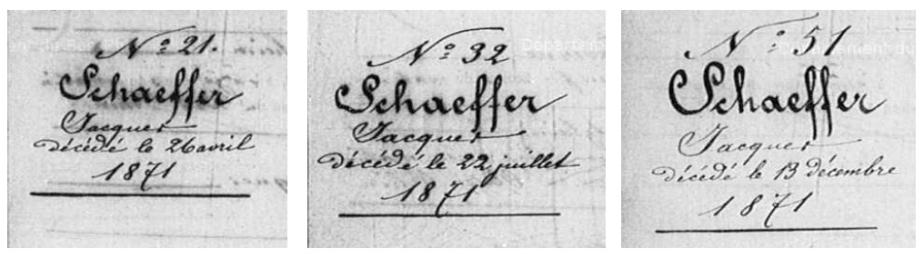 - Le 13 décembre 1871, acte de décès de «Jacques SCHAEFFER, cinq ans».