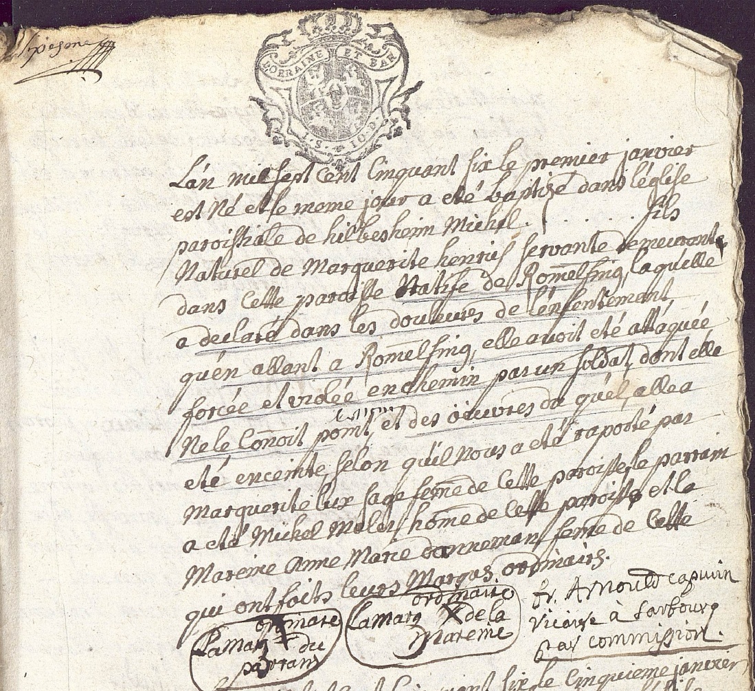 «L’an mil sept cent cinquante six, le premier janvier, est né et le même jour a été baptisé dans l’église paroissiale de Hilbesheim Michel …, fils naturel de Marguerite Henri, servante demeurant dans cette paroisse, native de Romelfing, laquelle a déclaré dans les douleurs de l’enfantement qu’en allant à Romelfing, elle avait été attaquée, forcée et violée en chemin par un soldat, dont elle ne connaît point le nom, et des œuvres duquel elle a été enceinte, selon qu’il nous a été rapporté par Marguerite Lux [?], sage-femme de cette paroisse.»